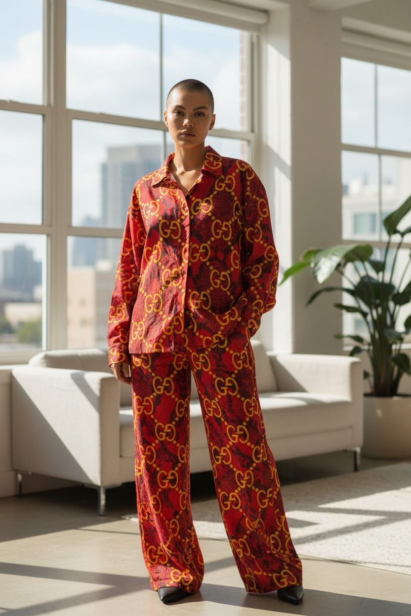 Upgrade your comfort style with this premium GG print quad set in a rich red satin fabric. Designed in a relaxed free size fit up to 4XL, with free-size shorts and pants for effortless comfort. Perfect for lounging, travel, or chic at-home wear.