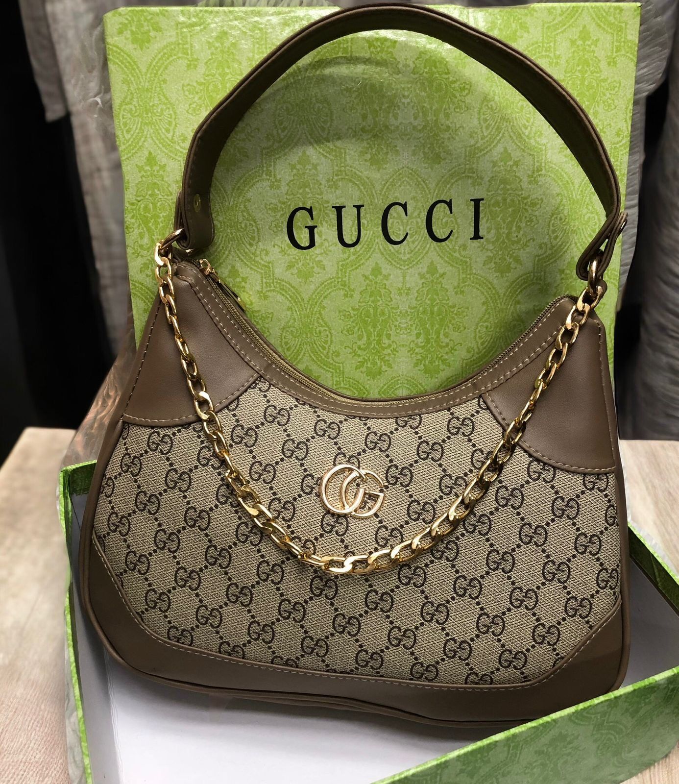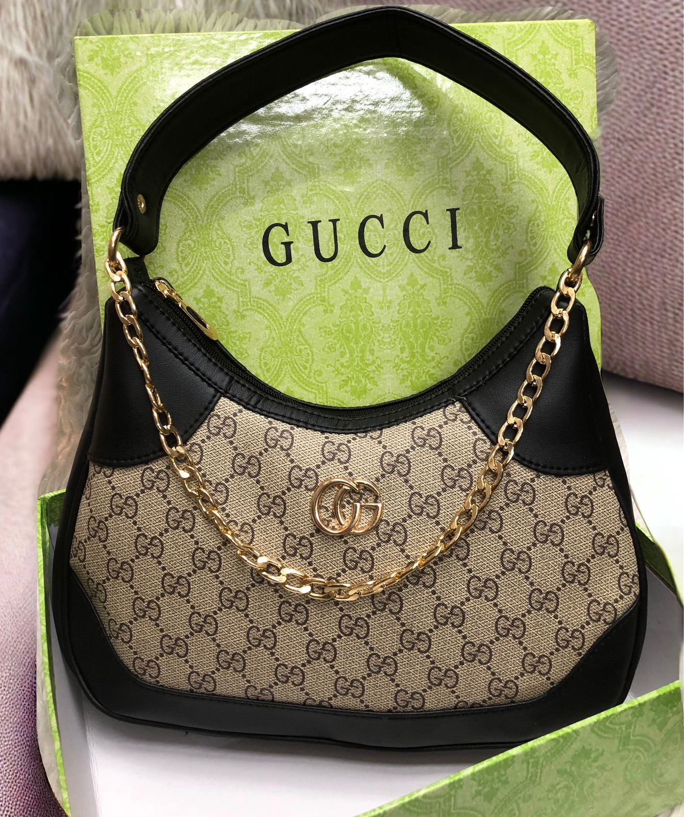 Upgrade your style with this very trending GC shoulder bag featuring a cute loop chain detail and a detachable sling belt for versatile styling. Spacious and elegant, it’s available in beige and black, perfect for everyday and chic outings