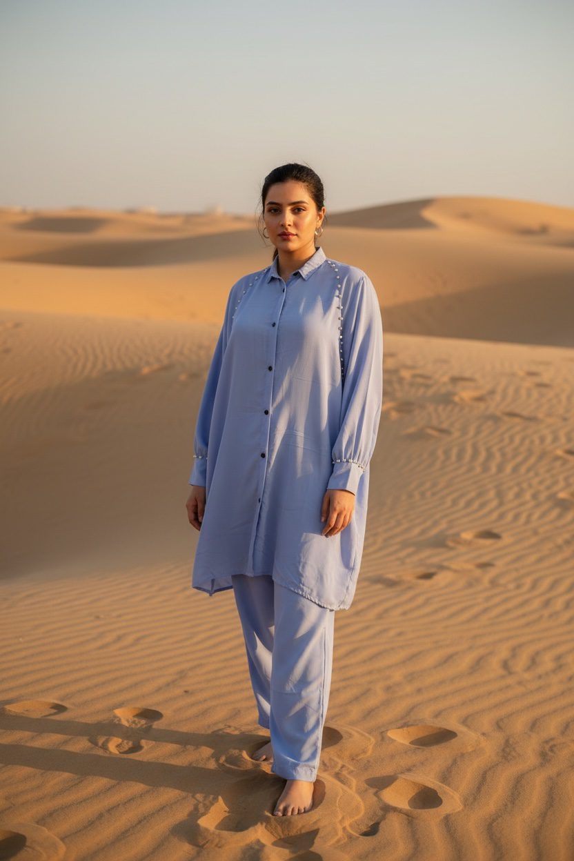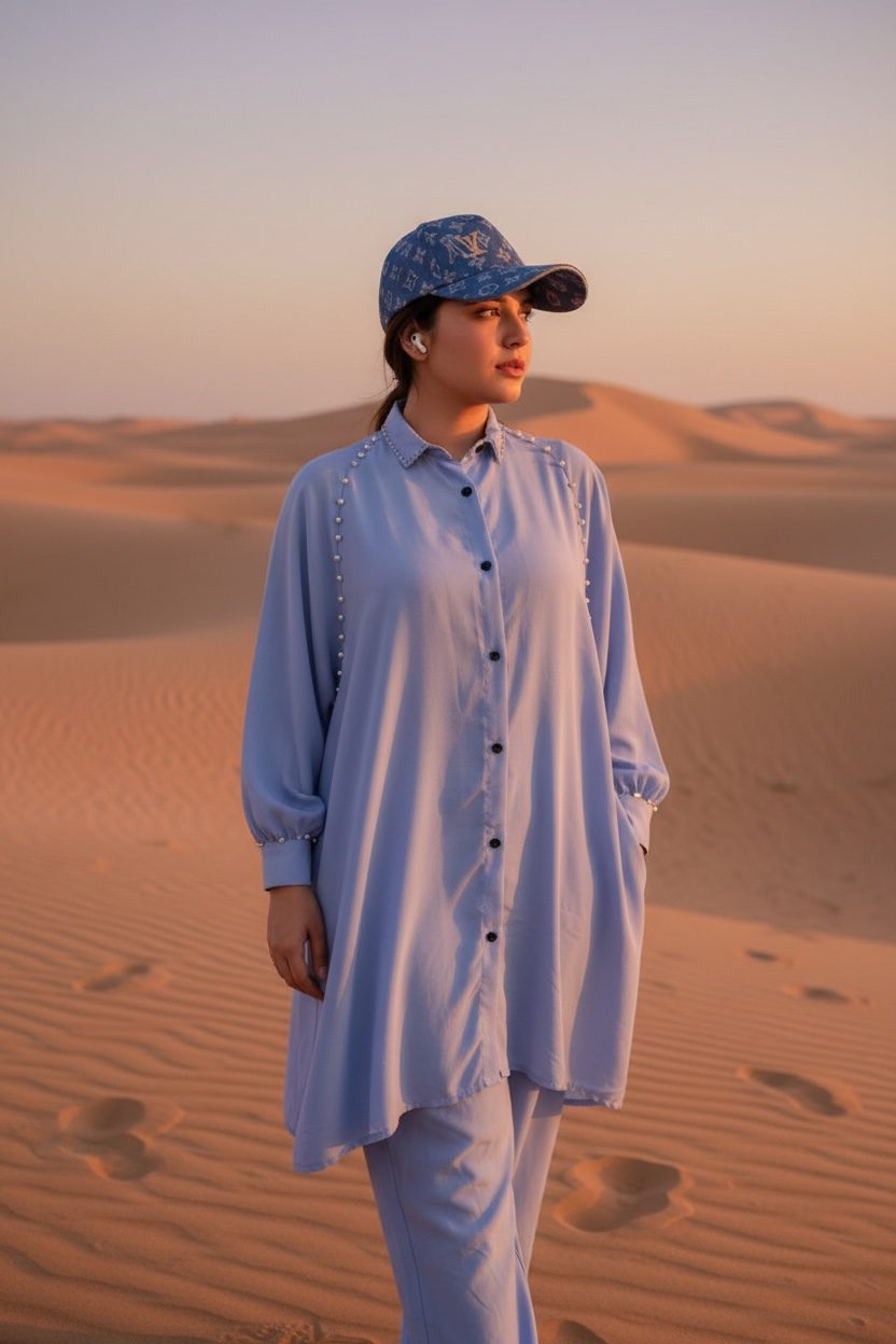 Newly designed kaftan-style kurta set made from premium imported georgette fabric. Features elegant foil work on the hands and shoulders. Free size, comfortably fits up to 5XL—perfect for a graceful and stylish look.