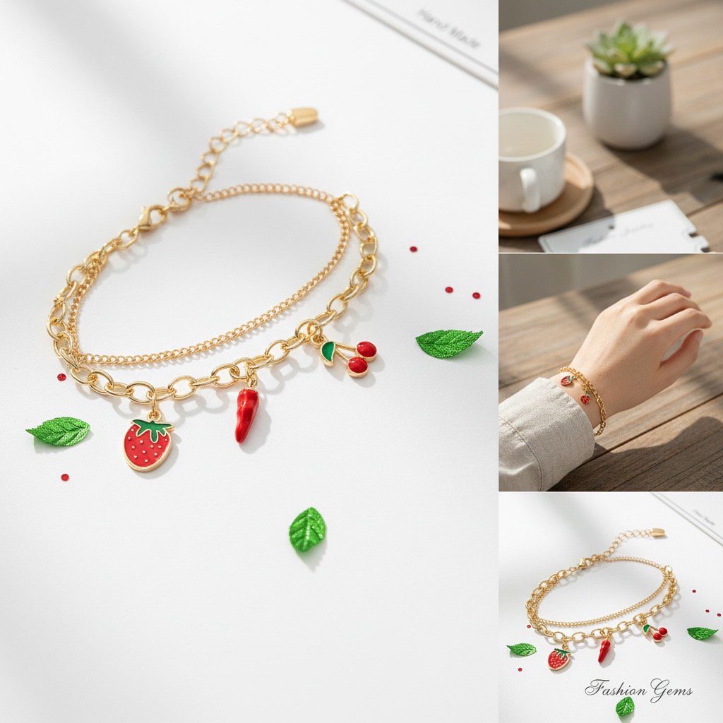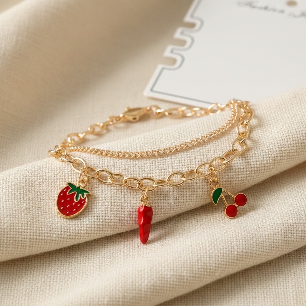 Add a playful pop of color to your look with this chain-type bracelet combo of two, designed with adorable red cherry, strawberry, and chili charms. The vibrant red tone gives a cute, trendy vibe inspired by viral charm and keychain styles.